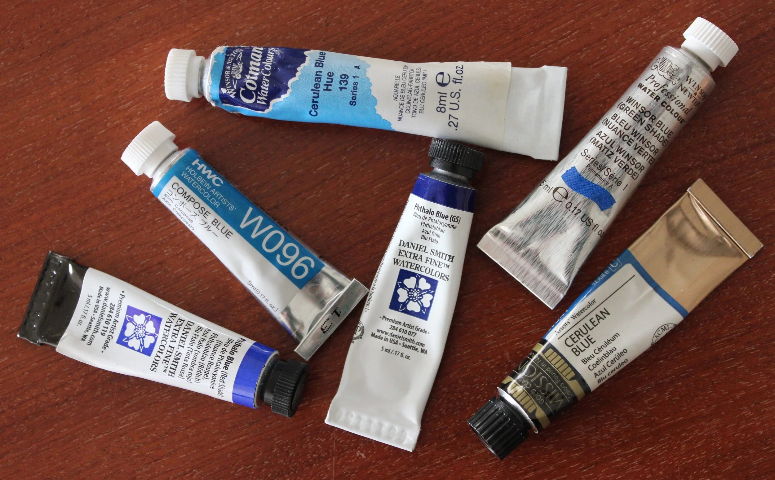 Occasionally manufacturers offer watercolor paints made with this pigment mixed with white (e.g. Compose Blue by Holbein) or in very low concentration (e.g. Cerulean Blue Hue, Cotman). These options appear easier to use when mixing because they do not overpower other paints; although I would stay away from these paints because of their lower transparency and altered handling properties.