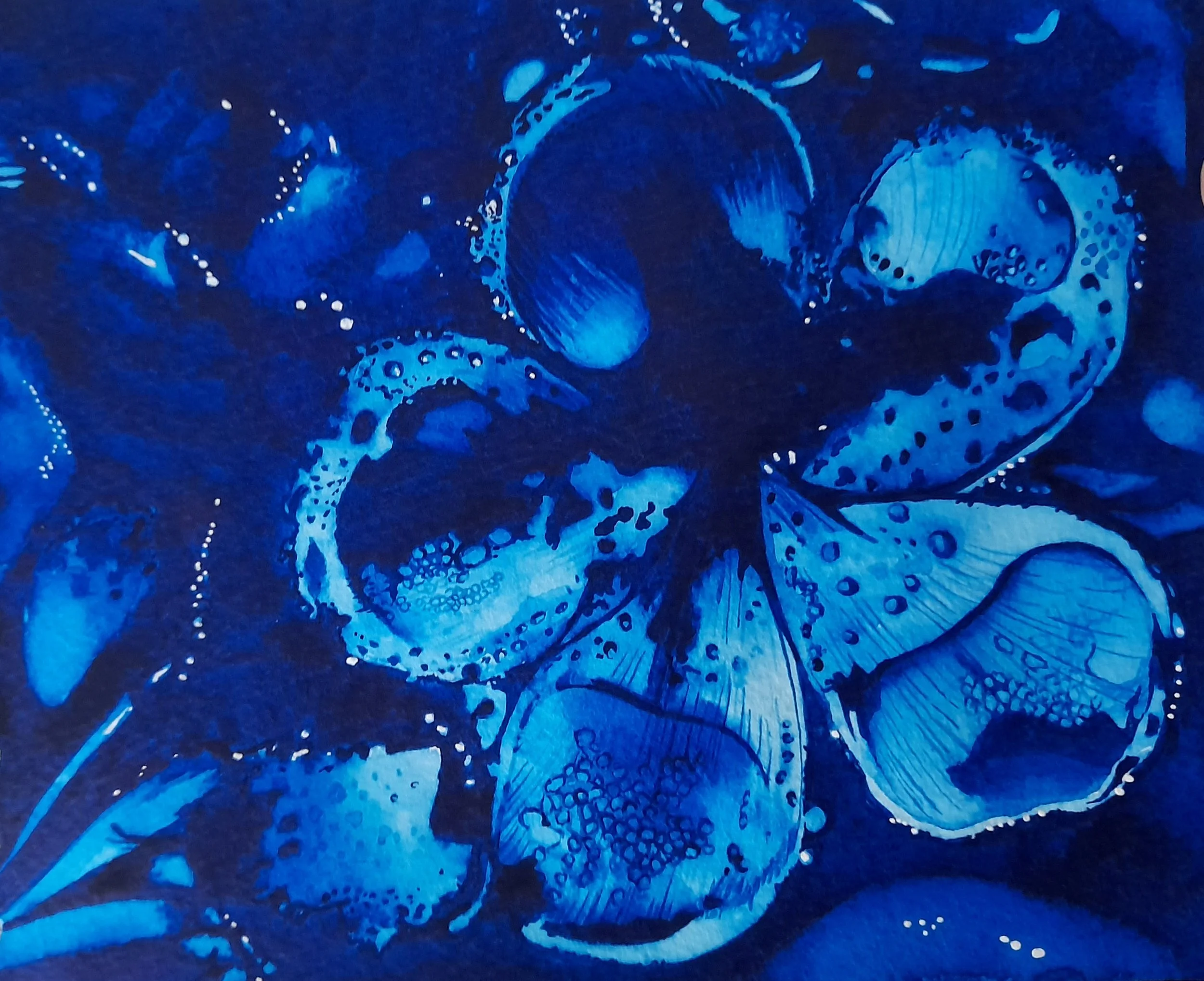 Fountain Frangipani (Valentina Urrutia Guada, 2025). A monochromatic painting made using Phthalo Blue Green Shade by Winsor & Newton.
